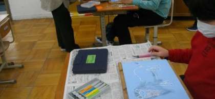 3組の学習の様子です。2学期の思い出をテーマにした作品や、大好きな動物をテーマにした作品があります。ていねいに彫り進めていますね。