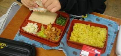 自宅から持参したお弁当箱に、中学校給食のごはんや総菜を詰めて、いつも食べている量との差などを比べてみました。