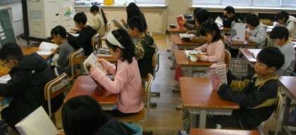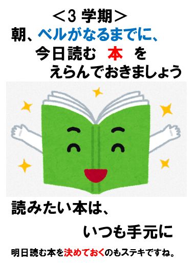 一部ですが、チャイムがなってから本を選ぶ子もいましたので、ポスターをはって呼び掛けています。「朝、ベルがなるまでに今日読む本を選んでおくこと」「読みたい本をいつも手元においておくこと等です。