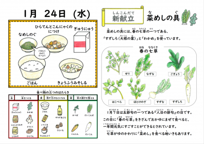 新献立の「菜めし」が提供されました。菜めしは、だいこん葉とわかめをいため、塩こしょうで味付けし、いりごまを合わせた混ぜごはんの具です。ちょっとしょっぱめの具でしたが、ごはんと混ぜ合わせるとちょうどよい味になりました。