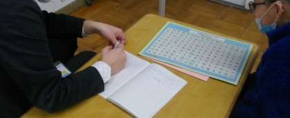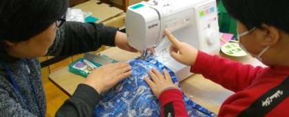 3組では、ミシンを使って作品作りに取り組んでいます。