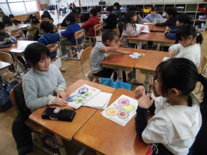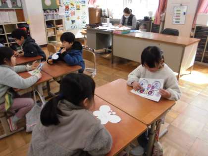 1年生は英語活動の学習で、自分のことを知ってもらうために前時で作った蝶々を友達に紹介しました。「使った色は、pink,blue,orangeです。」と使った色を英語で伝え、気に入っているところを紹介しました。聞いた人も「nice! good!」など英語で感想を伝えていました。