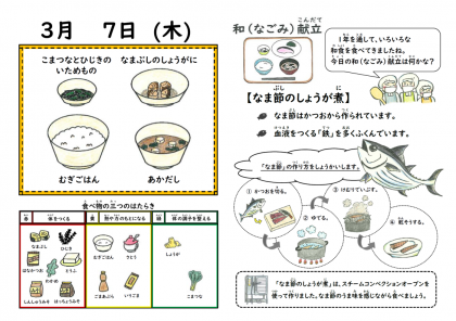 今日は3月のなごみ献立の日でした。なま節はスチコンで加熱することでふっくらとした食感に仕上がっていました。給食総選挙汁物部門2位の赤だしは、お増やしの行列ができるほど人気でした。