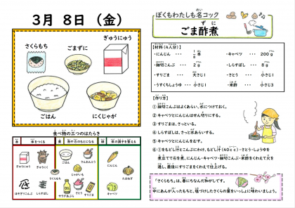 久しぶりに牛肉を使った肉じゃがが提供されました。噛みしめるほどに牛肉の旨味があふれ、子どもたちもごはんが進んでいました。春の和菓子であるさくらもちは、独特の香りやあんこが入っていることもあってか、好みが分かれている様子でした。