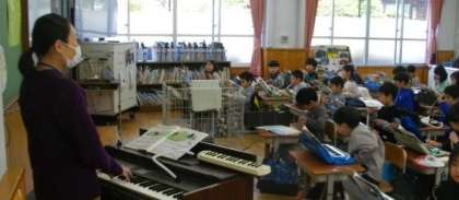 1年生は、いろいろな楽器の音の重なりを楽しみながら合奏に取り組んでいます。