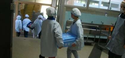 給食の準備が始まりました。今日もおいしく頂きましょう。