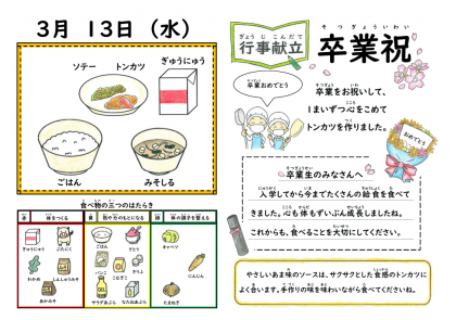 6年生の卒業祝献立として「とんかつ」が提供されました。この日に至るまでに、学校のいたるところでとんかつの話題が出ていました。厚みのある豚肉を給食室で1枚ずつ下味をつけ、衣をつけて揚げます。トマトケチャップとピューレを使ったソースも人気でした。