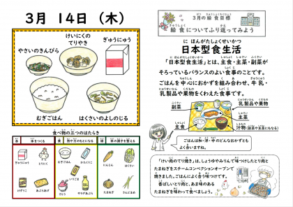 麦ごはん、牛乳、鶏肉の照り焼き、野菜のきんぴら、はくさいの吉野汁