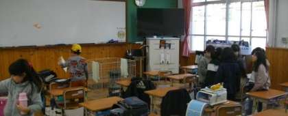 子どもたちが、かばんの中身を取り出して片づけをしています。折り紙クラブのお友達が作ってくれた作品が展示してあります。