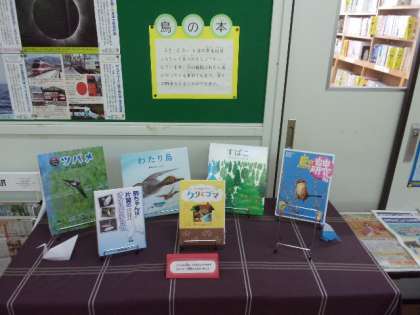 静市学習情報センターの前には、鳥にちなんだ本が紹介されています。
