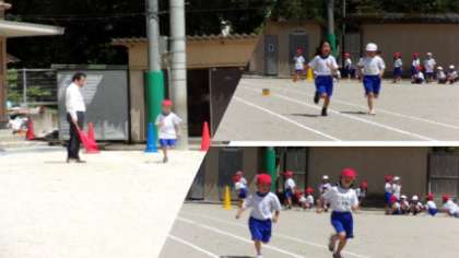 運動場で50メートル走をしました。