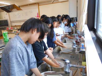 6年生は家庭科の学習で靴下を手洗いしました。1日履いていた靴下を洗濯水につけると水が薄黒くなり、それだけ汚れていたことに気付き、もみ洗いやつまみ洗いをして汚れを綺麗におとしました。