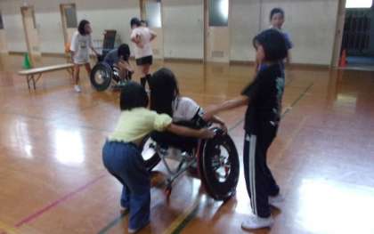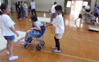 5年生が、総合的な学習の時間の中で、車いすに実際に乗って学習をしました。