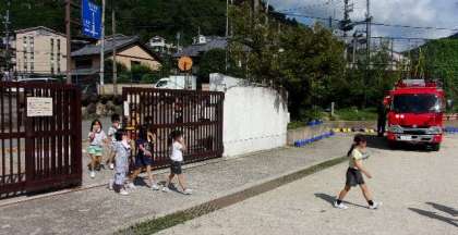 2校時に、左京消防署の署員さんが立会のもと、避難訓練を行いました。