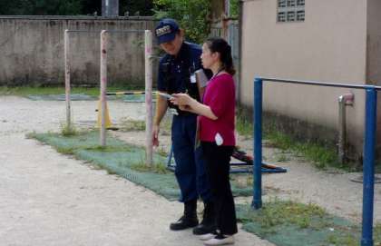 全員の避難完了後、教頭先生から消防隊員に人数の報告も行いました。