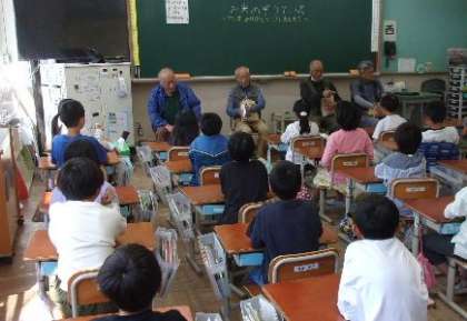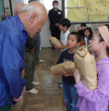 今日は、お米の贈呈式を行いました。収穫したお米を精米していただき、教室に届けて頂き、代表の子どもたちが受け取りました。