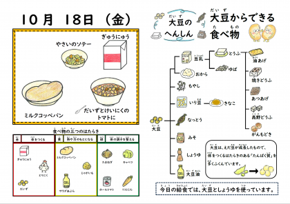 ミルクコッペパン、牛乳、大豆と鶏肉のトマト煮、野菜のソテー