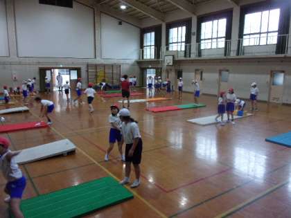 5年生は、マット運動。できる技はよりきれいに。