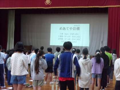 校長先生から、「楽しい」学校をみんなの力で作るための、めざす姿についてお話がありました。先月は2つの運動会がありましたが、どちらも達成できていたと〇をもらいました。