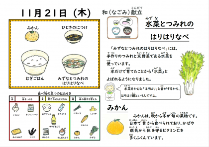 11月のなごみ献立の日でした。おだしの中に手作りのつみれを浮かべ、水菜を加えたはりはり鍋は、寒い日に温まる一品でした。冷凍ではない生のみかん(有田みかん)は、とても甘く、給食室にはみかんの皮だけが返ってきていました。