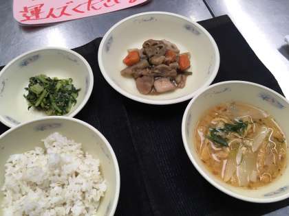 麦ごはん、鶏肉とれんこんのてり煮、だいこん葉とじゃこのいためもの、かぶらのみそ汁