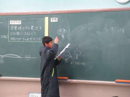 3年生は理科の学習で、電池を使って豆電球に明かりをつける学習をしました。
