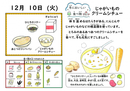 寒い日に食べたくなる献立の1つクリームシチューが登場しました。大きめに切ったじゃがいもの他に彩りがきれいなにんじん、たまねぎが入っています。パンとともにおいしそうに食べる様子がみられました。