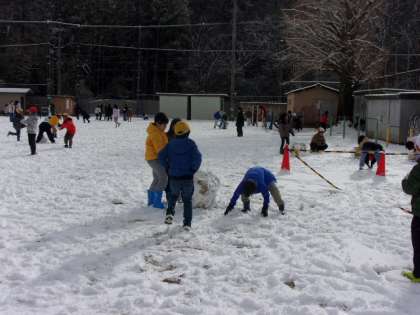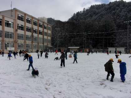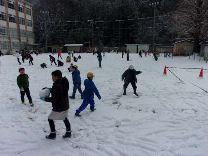 中間休みのタイミングで、雪やみました。朝は遊べるほどの積雪ではなかったのですが、雪を満喫できるくらいに積もっていました。子どもたちに負けじと教職員も一緒に遊んでいました。