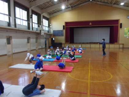 2年生は後転ができるようになるために、カブのように・・・と足を挙げていました。、