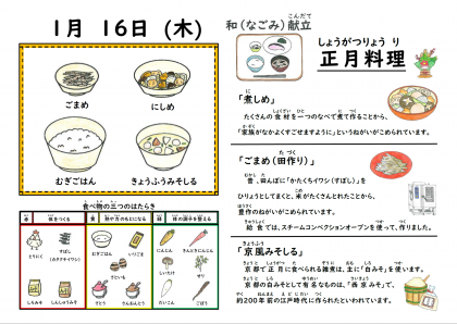1月のなごみ献立の日でした。正月料理(おせち料理)として「煮しめ」と「ごまめ(田作り)」、汁物には、白みそを使った雑煮風の「京風みそ汁」が提供されました。それぞれの献立に込められた思いにも触れながら、味わって食べている様子でした。