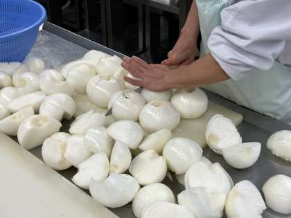 ポークビーンズの材料を下ごしらえしています。北海道産の大豆は、ぷっくらやわらかくなるように釜でゆで上げます。新玉ねぎもとても良質な物が納品されました。
