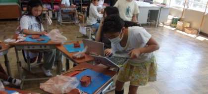 4年生は粘土で作った作品を、タブレットで撮影していました。