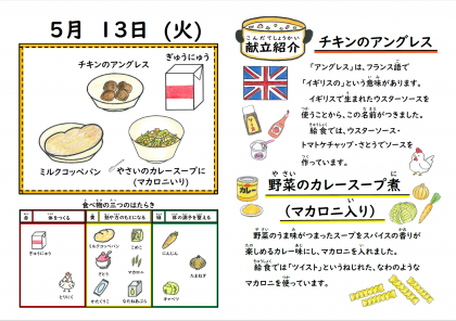 新献立の「野菜のカレースープ煮」が提供されました。カレー粉が入ることによって、野菜の甘味を感じるスープの中にスパイシーさがプラスされていました。チキンのアングレスとともに子どもたちにも好評でした。