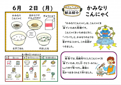 今日から6月の給食が始まりました。プリプリ食感のこんにゃくをさとう、みりん、しょうゆ、だし汁でいため煮にした「かみなりこんにゃく」は、提供される回数こそ少ないですが、ひそかに人気のある献立です。ツナの旨味を感じられるおからツナ丼も子どもたちに好評でした。