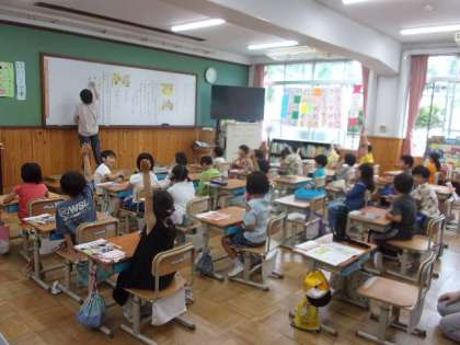 1年生は、道徳の時間。自分の考えや意見を手を挙げて発表できるようになっています。