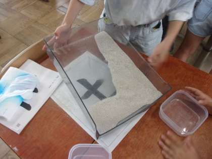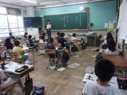 3年生は、書写です。習字道具を使って書くのはなかなか難しそうですが、砂や水書用紙で練習しています。