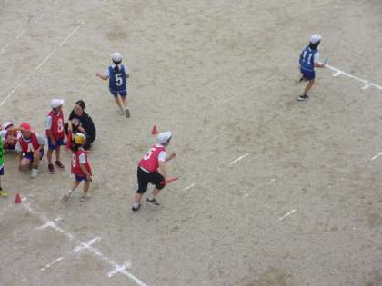 4年生は、体育「リレー」。バトンパスでタイムが縮んでいるかな。