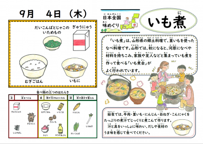 山形県の郷土料理「いも煮」が提供されました。牛肉とともに里いも、こんにゃく、白ねぎ、にんじんを煮込みました。それぞれのクラスでいも煮会が開催され、おいしかったの声も多く聞かれました。