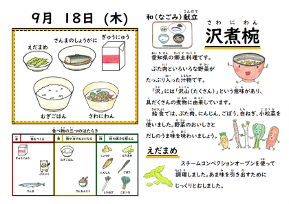 9月のなごみ献立が提供されました。久々に登場となった沢煮椀は、けずりぶしの出汁に豚肉の旨味が合わさり、普段の汁物とは違った味わいになっていました。