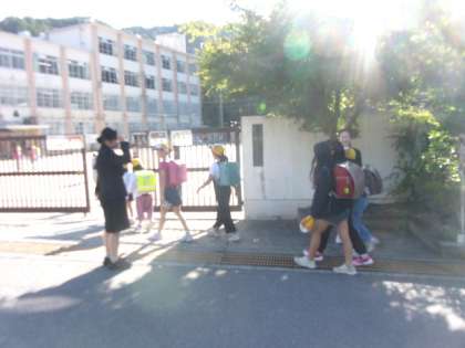 正門で教育実習生さんも一緒に朝のあいさつ。