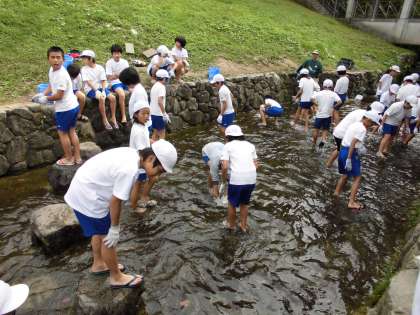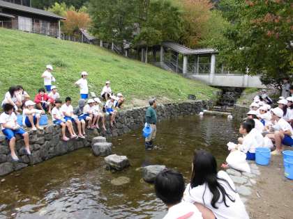 午前中は少し晴れ間もあり,松井前校長先生の指導のもと,魚つかみを楽しみました。