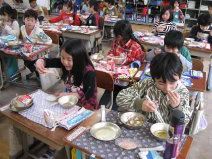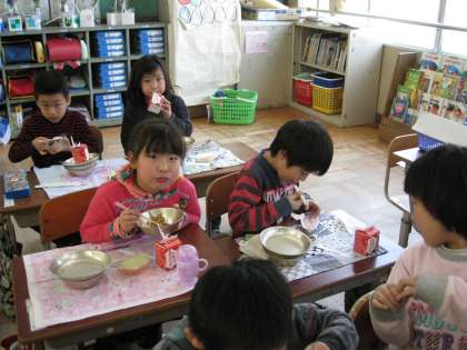 今日の給食は、ひなまつり献立で、1年生の子どもたちは、初めて三色ゼリーを食べました。