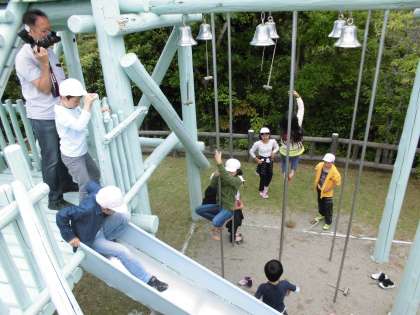 「浦山ラリー」の「山の砦」の様子です。すべての班がここまでたどり着きました。上り棒を上って鐘を鳴らしている児童もいました。砦からは,周辺の海や山が一望できます。