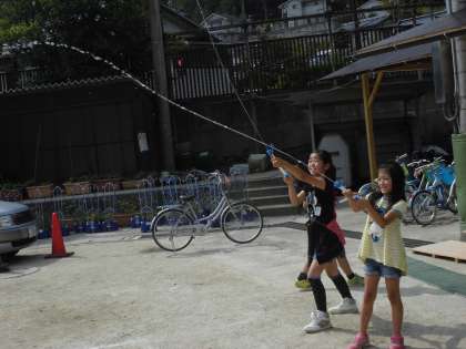 理科の学習のまとめとして,体育館で空気でっぽう,運動場で水でっぽうをしました。子どもたちはいろんな飛ばし方をして,空気と水との体積の違い,手ごたえの違いを確認しているようでした。