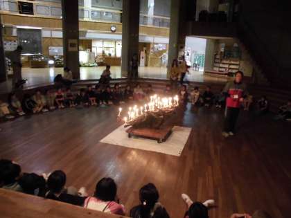 1日目夜の活動は,ボンファイヤーです。ろうそくの灯を眺めながら,まず市原野小 飛田校長先生の話と鞍馬小 中村教頭先生のお話を聞きました。そのあとは,グループできょう一日の反省をして,「世界が一つになるまで」をみんなで歌いました。とても幻想的な良い空気に包まれました。