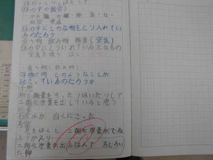 そこで,「息をしている」(呼吸)について学習をスタートしました。何気なくしている呼吸について,深呼吸したりいろいろ活動をしながら話し合い