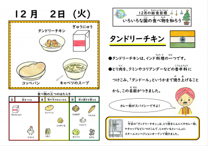 インドの料理として「タンドリーチキン」が提供されました。にんにく、塩、ケチャップ、カレー粉といった調味料で鶏肉を漬け込んだ後、じゃがいもと共にスチコンで焼き上げています。3年生の教室では、お増やしのチキンを求めて、熱いじゃんけん大会が行われていました。