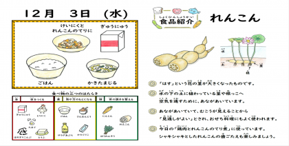The和食な給食が提供されました。昨年新献立として登場した鶏肉とれんこんのてり煮が再登場しました。旬のれんこんを鶏もも肉、にんじんとともに煮付けました。こんぶのもどし汁も使い、うまみたっぷりでごはんともよく合う煮物に仕上がりました。
