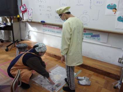 3組では、中力粉を踏んづけていました。何ができるのかな。