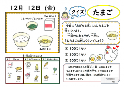人気のあげたま煮が提供されました。ふわふわ食感のたまごの中に甘辛い味の油あげが合わさって、ごはんがよく進みました。小松菜のごまいためも、シャキシャキとした食感を子どもたちは味わっていたようです。